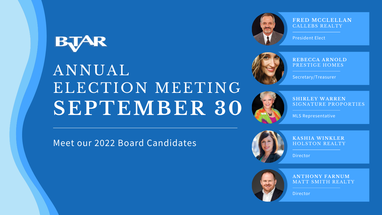 Pursuant to the Bylaws of the Bristol Tennessee-Virginia Association of REALTORS®, Inc., the Annual Meeting and Election of Officers and Directors will be held at 11:30 a.m. on Thursday, September 30, 2021 at Warehouse 817 in Bristol, VA. Boxed lunches will be provided from Bristol Cafe and Market!