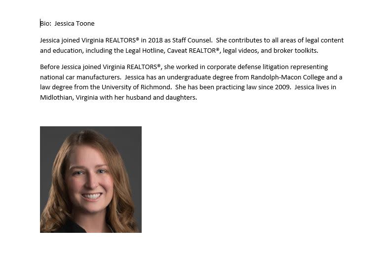 Instructor: Jessica Toone - Associate General Counsel, Virginia REALTORS